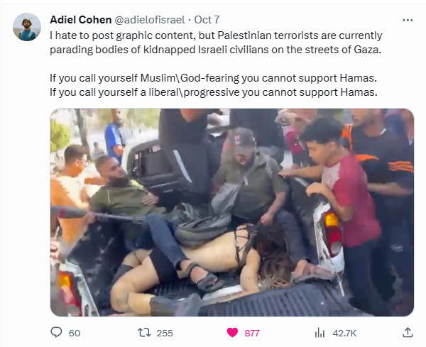 Several of these rape victims appear to have been later executed. Others were taken to Gaza. In photographs released online, you can see several paraded through the city’s streets, blood gushing from between their legs.